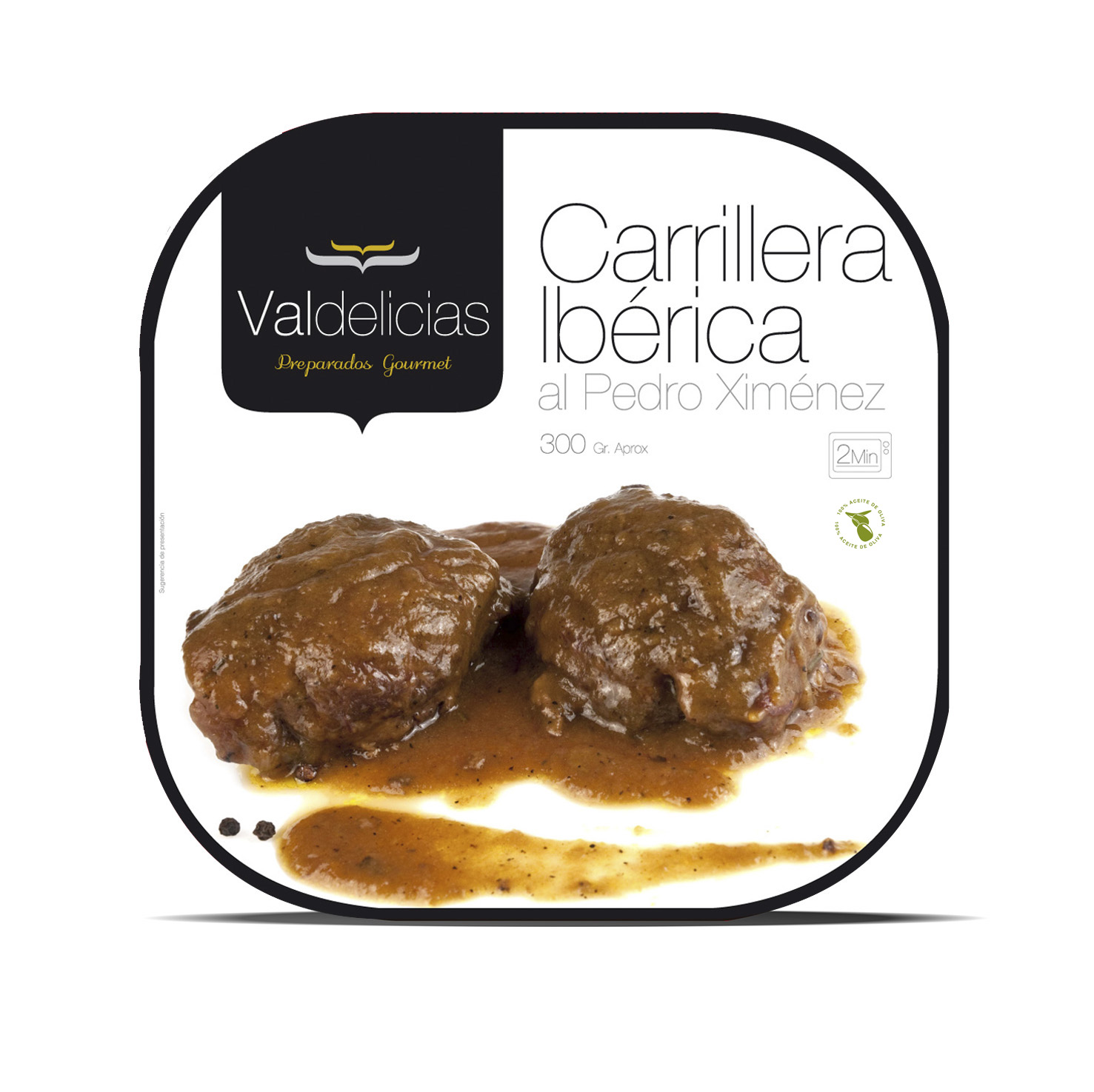 Carrillera de cerdo ibérico (60%), salsa (40%): cebolla, puerro, zanahoria, aceite de oliva, ajo, harina de maíz, vino Pedro Ximénez, sal, especias y extractos de especias; conservadores: E-250, E-202.